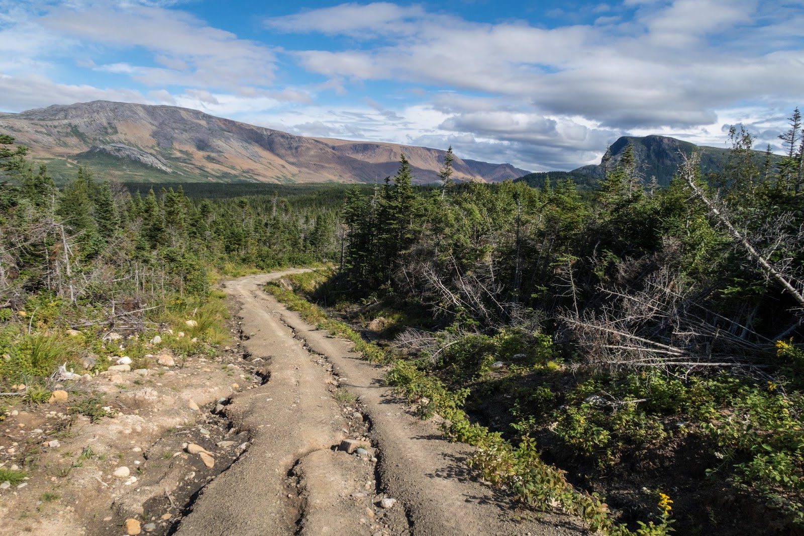 I had arranged for my parents to pick me up. When I reached the main road (still unpaved) to Trout River, I turned right and continued that way as they weren't there yet. I hoped they hadn't gone past the pick up point. We had arranged a backup plan to meet at the post office in town. Soon I saw their vehicle and my hike on the UltramaTrex was complete. There were some nice views as we drove to Trout River.